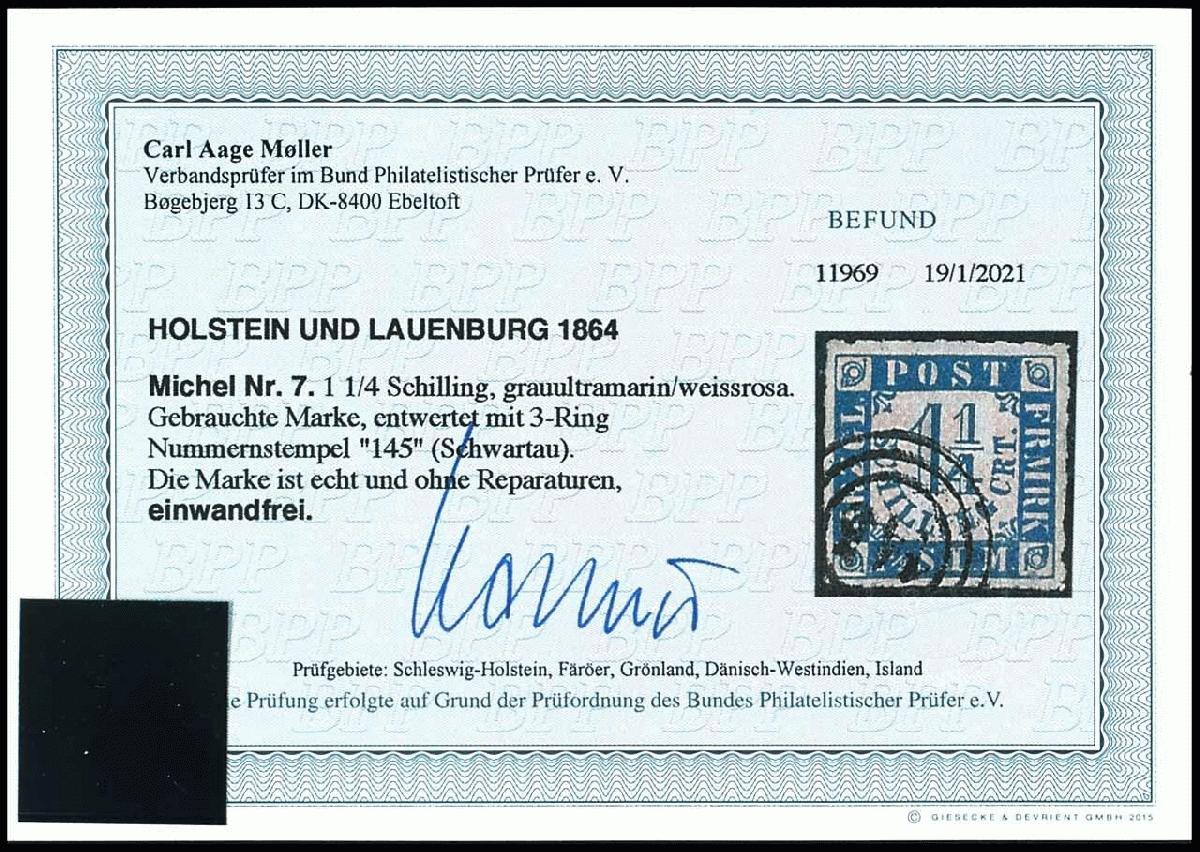 | Zusatzinformationen und Suchstichworte: | Dr. Reinhard Fischer 190. Auktion 27. - 28. Januar 2023 Los 995 Altdeutschland Schleswig Holstein "145" - Schwartau, 3-Ring-Nummernstempel auf Kabinettstück 1 1/4 Schillinge mittelblau/weißrosa auf Briefstück, Fotobefund Carl Aage Moeller BPP: "echt und einwandfrei", seltener Stempel! Ausruf 70,00 EUR |