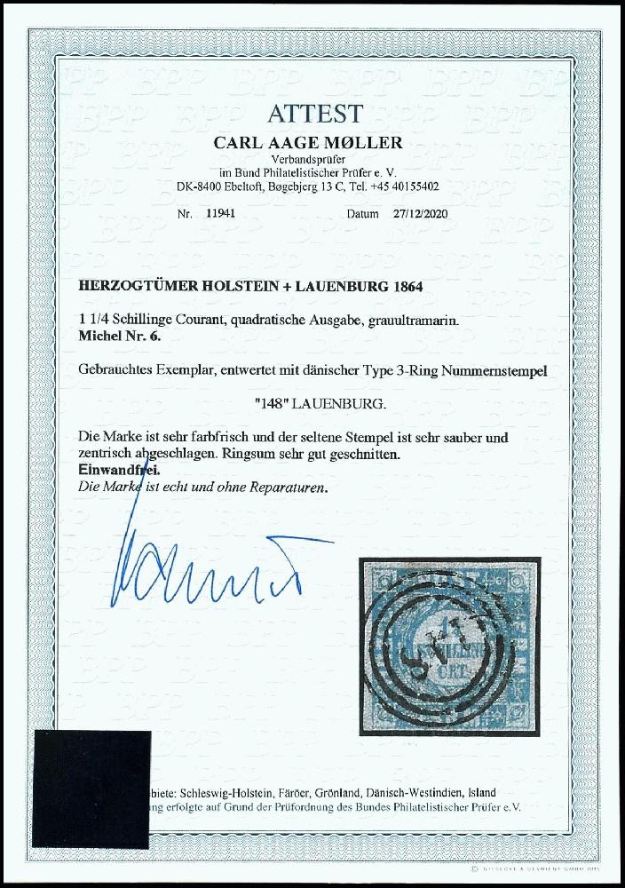 | Zusatzinformationen und Suchstichworte: | Dr. Reinhard Fischer 190. Auktion 27. - 28. Januar 2023 Los 999 Altdeutschland Schleswig Holstein "148" - Lauenburg, 3-Ring-Nummernstempel auf Kabinettstück 1 1/4 Schillinge grauultramarin, Fotoattest Carl Aage Moeller BPP: "echt und einwandfrei" Ausruf 50,00 EUR |
