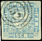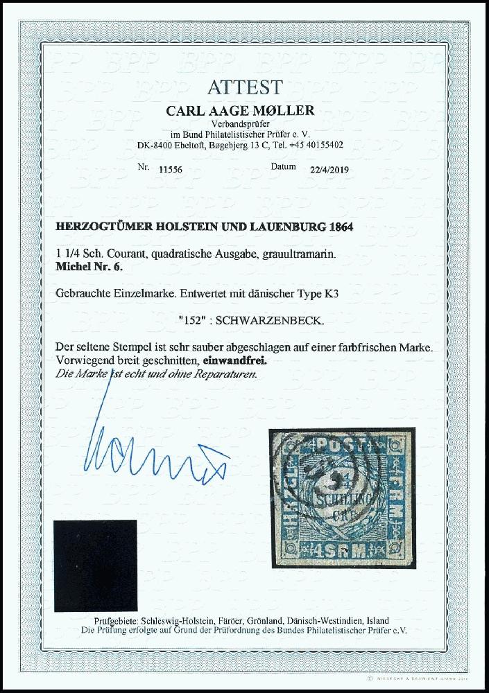 | Zusatzinformationen und Suchstichworte: | Dr. Reinhard Fischer 190. Auktion 27. - 28. Januar 2023 Los 1002 Altdeutschland Schleswig Holstein "152" - Schwarzenbeck, 3-Ring-Nummernstempel auf Kabinettstück 1 1/4 Schillinge grauultramarin, Fotoattest Carl Aage Moeller BPP: "echt und einwandfrei" seltener Stempel! Ausruf 150,00 EUR |