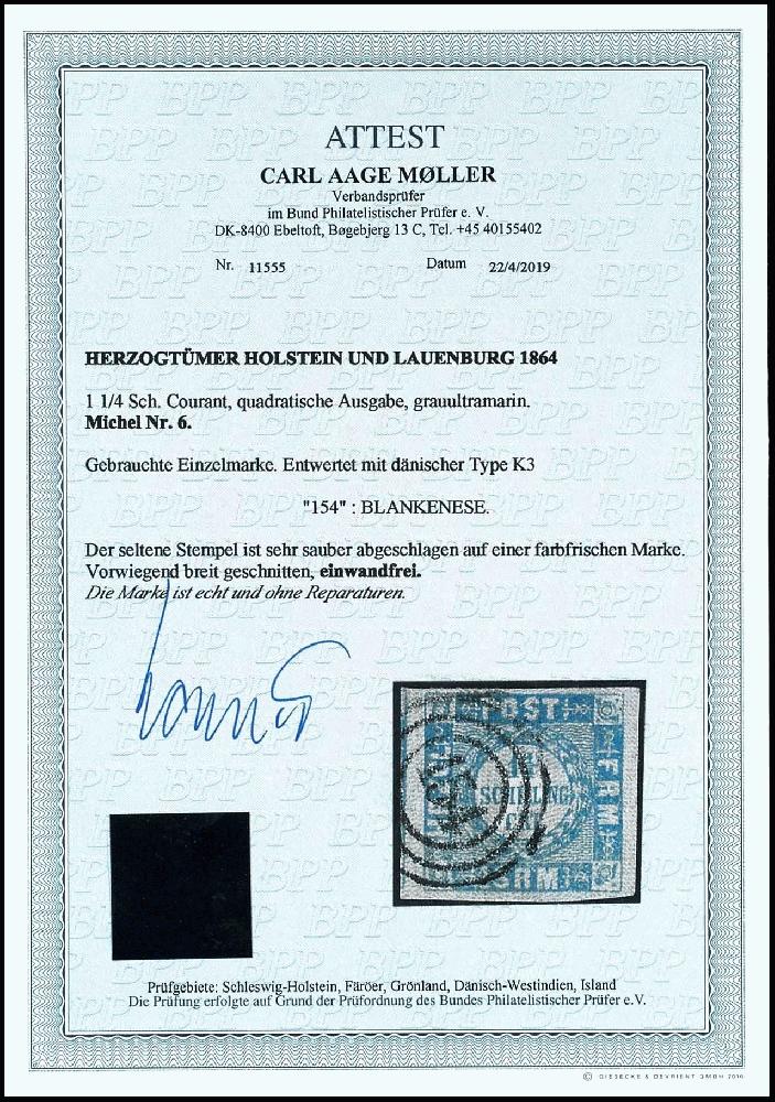 | Zusatzinformationen und Suchstichworte: | Dr. Reinhard Fischer 190. Auktion 27. - 28. Januar 2023 Los 1004 Altdeutschland Schleswig Holstein "154" - Blankenese, 3-Ring-Nummernstempel klar auf Kabinettstück 1 1/4 Schilling grauultramarin, Fotoattest Carl Aage Moeller BPP: "echt und einwandfrei", seltener Stempel! Ausruf 150,00 EUR |