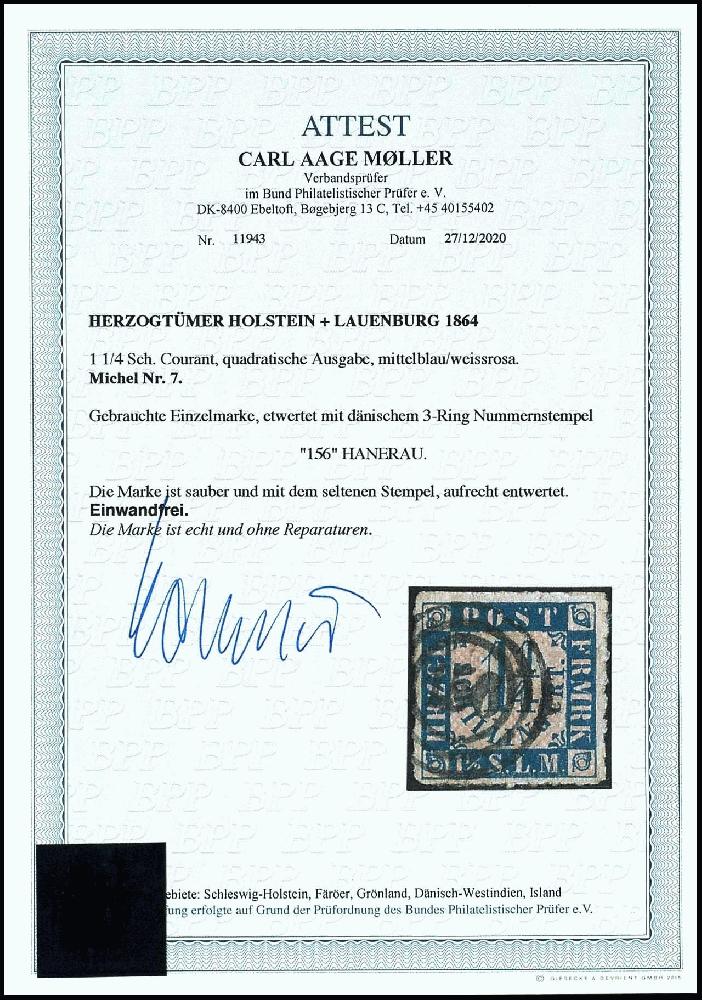 | Zusatzinformationen und Suchstichworte: | Dr. Reinhard Fischer 190. Auktion 27. - 28. Januar 2023 Los 1006 Altdeutschland Schleswig Holstein "156" - Hanerau, 3-Ring-Nummernstempel klar auf 1 1/4 Schilling grauultramarin/weißrosa, Fotoattest Carl Aage Moeller BPP: "echt und einwandfrei", seltener Stempel! Ausruf 100,00 EUR |