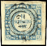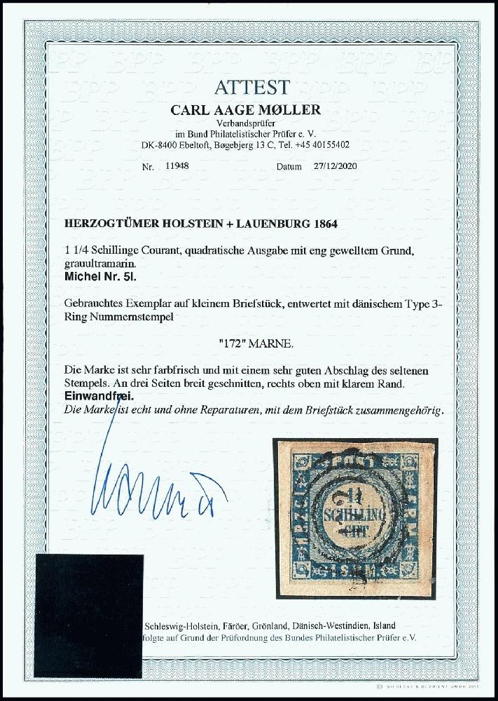 | Zusatzinformationen und Suchstichworte: | Dr. Reinhard Fischer 190. Auktion 27. - 28. Januar 2023 Los 1011 Altdeutschland Schleswig Holstein "172" - Marne, 3-Ring-Nummernstempel klar auf 1 1/4 Schilling grauultramarin, Type I = eng gewellter Grund, Fotoattest Carl Aage Moeller BPP: "echt und einwandfrei", seltener Stempel! Ausruf 100,00 EUR |