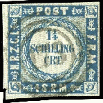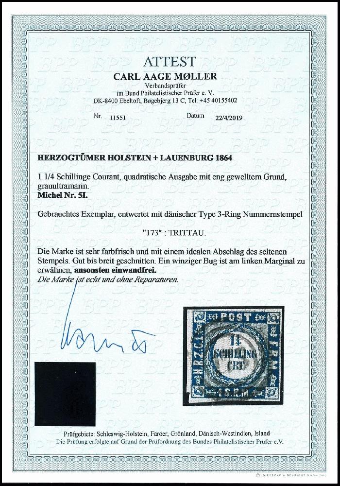 | Zusatzinformationen und Suchstichworte: | Dr. Reinhard Fischer 190. Auktion 27. - 28. Januar 2023 Los 1014 Altdeutschland Schleswig Holstein "173" - Trittau, 3-Ring-Nummernstempel klar auf 1 1/4 Schilling grauultramarin, Type I = eng gewellter Grund, Fotoattest Carl Aage Moeller BPP: "echt und winziger Bug, ansonsten einwandfrei", seltener Stempel! Ausruf 50,00 EUR |