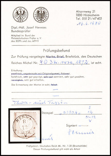 | Prüfer: | Hennies, Josef (BPP (Bund Philatelistischer Prüfer)) |