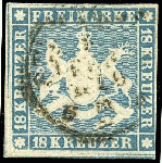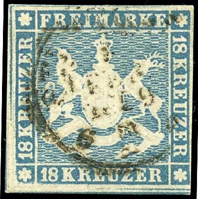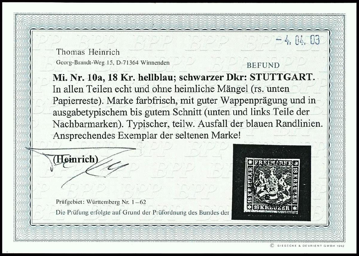 | Zusatzinformationen und Suchstichworte: | Dr. Reinhard Fischer 190. Auktion 27. - 28. Januar 2023 Los 1362 Altdeutschland Württemberg 18 Kr hellblau tadellos gestempelt STUTTGART, Fotobefund Heinrich BPP: "In allen Teilen echt und ohne heimliche Mängel (rs. unten Papierreste). Marke farbfrisch, mit guter Wappenprägung und in ausgabetypischem bis guten Schnitt (unten und links Teile der Nachbarmarken. Typischer, teilw. Ausfall der Randlinien. Ansprechendes Exemplar der seltenen Marke!" Mi. 1.600.- Ausruf 600,00 EUR |