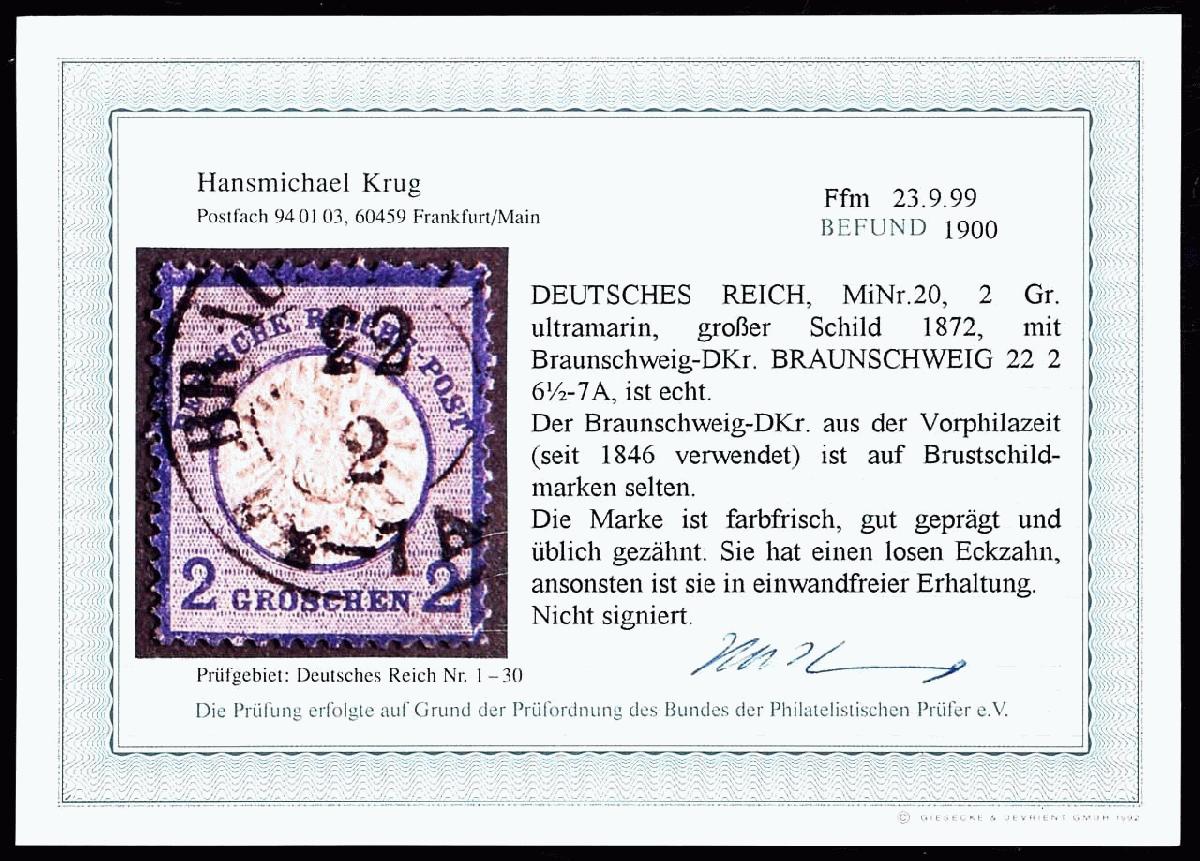 | Zusatzinformationen und Suchstichworte: | Dr. Reinhard Fischer 190. Auktion 27. - 28. Januar 2023 Los 369 Deutsches Reich "BRAUNSCHWEIG 22 2" - Vorphila-K2, klarer Teilabschlag auf 2 Gr. großer Schild, auf Brustschilden eine seltene Entwertung, Fotobefund Krug BPP "Sie hat einen losen Eckzahn, ansonsten ist sie in einwandfreier Erhaltung." Ausruf 40,00 EUR |