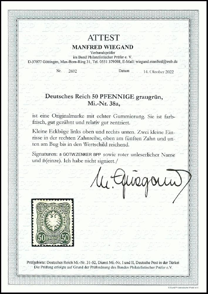 | Zusatzinformationen und Suchstichworte: | Dr. Reinhard Fischer 190. Auktion 27. - 28. Januar 2023 Los 18 Deutsches Reich, 1875 Pfennige 50 Pfennig, graugrün, ungebraucht mit Originalgummierung, Fotoattest Wiegand BPP (2022): "Kleine Eckbüge links oben und rechts unten. Zwei kleine Einrisse in der rechten Zahnreihe, oben am fünften Zahn und unten am Bug bis in den Wertschild reichend.", Mi. 2.500.- - in ungebrauchter Erhaltung eine sehr seltene Marke Ausruf 300,00 EUR |