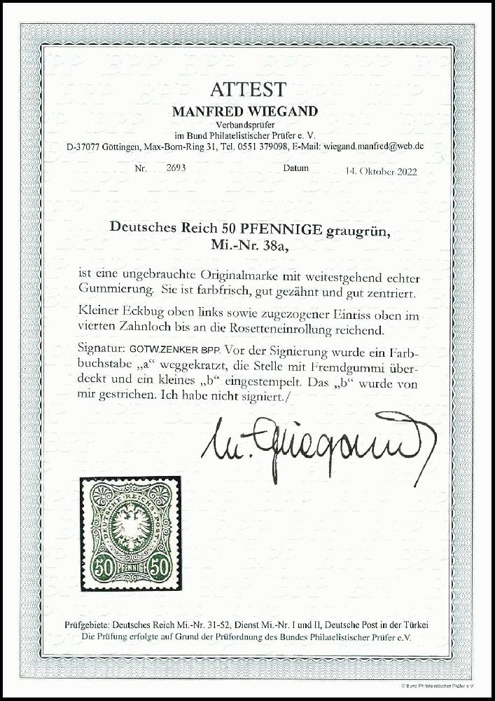 | Zusatzinformationen und Suchstichworte: | Dr. Reinhard Fischer 190. Auktion 27. - 28. Januar 2023 Los 19 Deutsches Reich, 1875 Pfennige 50 Pfennig, graugrün, ungebraucht mit großen Teilen der Originalgummierung, Fotoattest Wiegand BPP (2022): "Kleiner Eckbug oben links, sowie zugezogener Einriss oben im vierten Zahnloch bis an die Rosetteneinrollung reichend.", Mi. 2.500.- - in ungebrauchter Erhaltung eine sehr seltene Marke Ausruf 300,00 EUR |