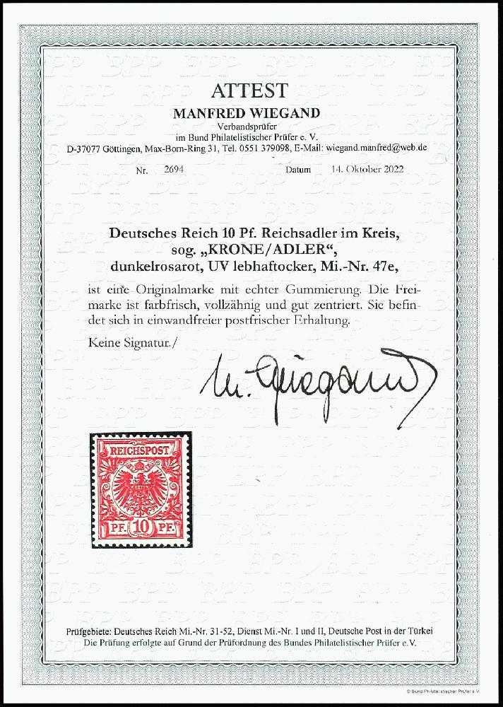 | Zusatzinformationen und Suchstichworte: | Dr. Reinhard Fischer 190. Auktion 27. - 28. Januar 2023 Los 25 Deutsches Reich, 1889 Krone/Adler 10 Pfg Krone/Adler dunkelrosarot, tadellos postfrisch, unsigniert, Fotoattest Wiegand BPP (2022): "in einwandfreier, postfrischer Erhaltung.", Mi. 800.- - in unserer 188. Auktion erzielte eine signierte Marke einen Zuschlag von 500.- Euro! Ausruf 320,00 EUR |