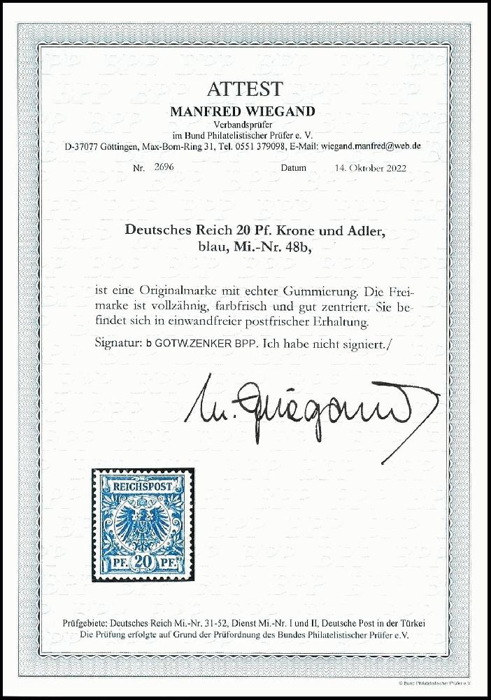 | Zusatzinformationen und Suchstichworte: | Dr. Reinhard Fischer 190. Auktion 27. - 28. Januar 2023 Los 28 Deutsches Reich, 1889 Krone/Adler 20 Pfennig Krone/Adler, blau, tadellos postfrisch, gepr. Zenker BPP und Fotoattest Wiegand BPP (2022): "in einwandfreier, postfrischer Erhaltung.", Mi. 550.- Ausruf 180,00 EUR |