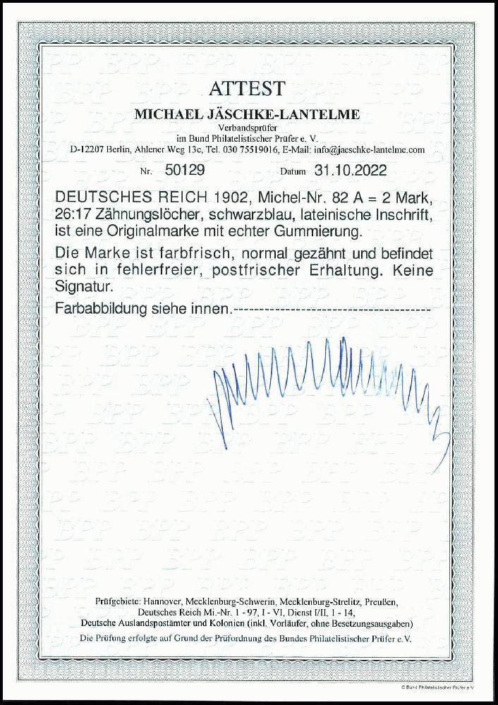 | Zusatzinformationen und Suchstichworte: | Dr. Reinhard Fischer 190. Auktion 27. - 28. Januar 2023 Los 40 Deutsches Reich, Germania ohne WZ 2 Mark Deutsches Reich, schwarzblau, 26 : 17 Zähnungslöcher, lateinische Inschrift, tadellos postfrisch, unsigniert, Fotoattest Jäschke-Lantelme BPP (2022): "In fehlerfreier, postfrischer Erhaltung.", Mi. 500.- Ausruf 150,00 EUR |