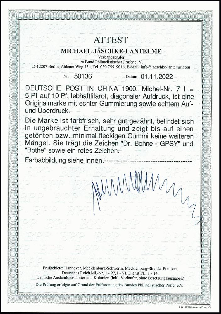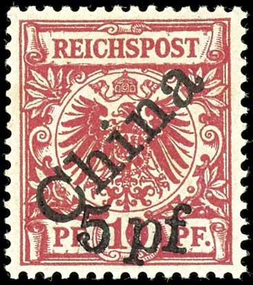 | Zusatzinformationen und Suchstichworte: | Dr. Reinhard Fischer 190. Auktion 27. - 28. Januar 2023 Los 44 Deutsche Auslandspost China 5 Pf. auf 10 Pfennig Krone/Adler, lebhaftlilarot mit diagonalem Bdr.-Aufdruck "China", ungebraucht mit Originalgummierung (getönt und leicht fleckig), gepr. Bothe und Bohne GPSY sowie Fotoattest Jäschke-Lantelme BPP (2022), Mi. 800.- Ausruf 150,00 EUR |