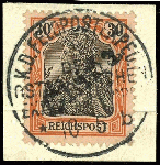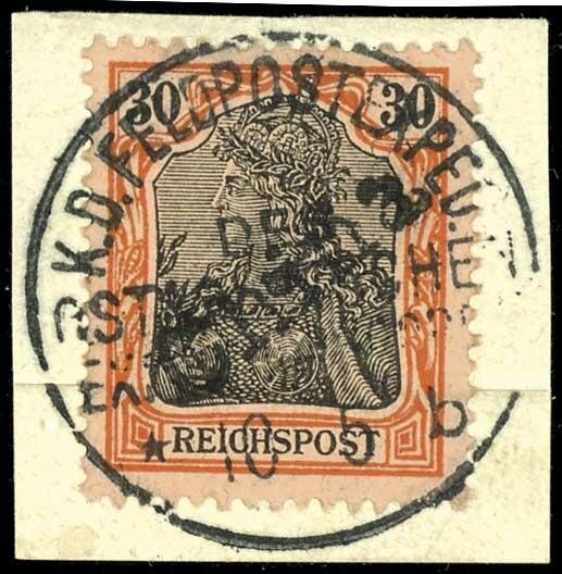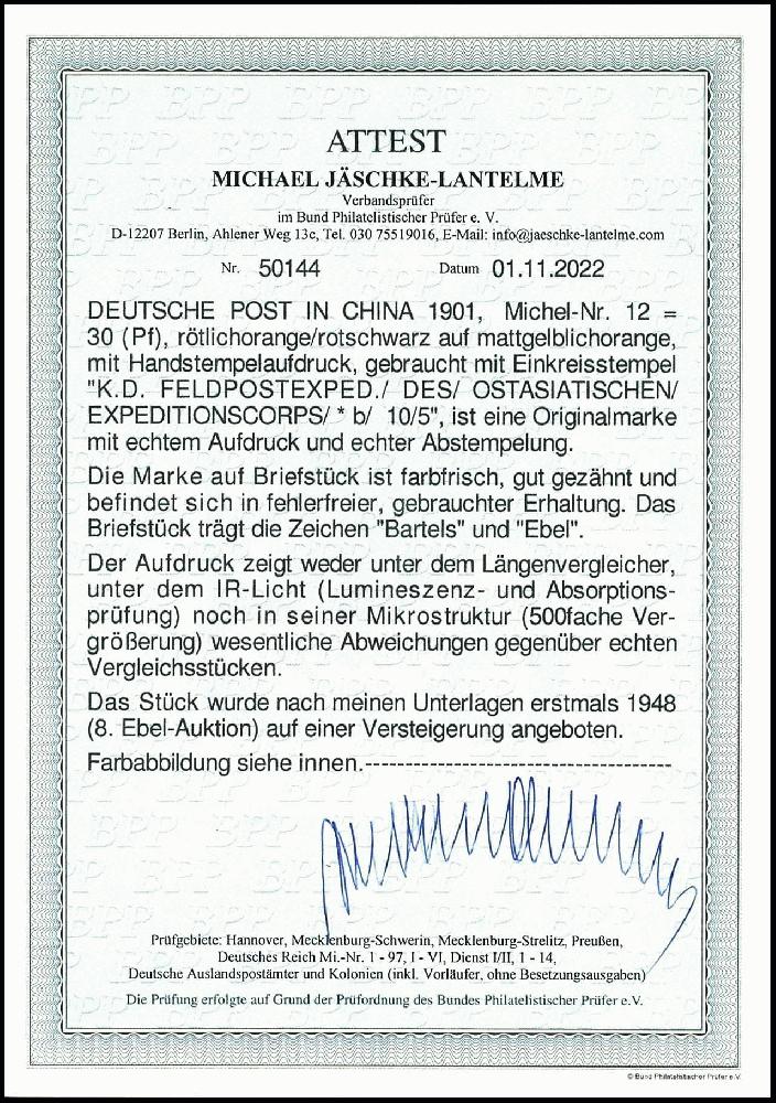 | Zusatzinformationen und Suchstichworte: | Dr. Reinhard Fischer 190. Auktion 27. - 28. Januar 2023 Los 53 Deutsche Auslandspost China 30 Pfennig Germania mit Handstempelaufdruck "China", entwertet "K. D. FELDPOSTEXPED./ DES / OSTASIATISCHEN / EXPEDITIONSCORPS / * b / 10/5" auf Briefstück, tadellose Erhaltung, gepr. Bartels, Ebel und Fotoattest Jäschke-Lantelme BPP (2022): "in fehlerfreier, gebrauchter Erhaltung.", Mi. 6.000.- - eine sehr seltene Marke! Provenienz: 8. Ebel Auktion 1948 Ausruf 2.000,00 EUR |