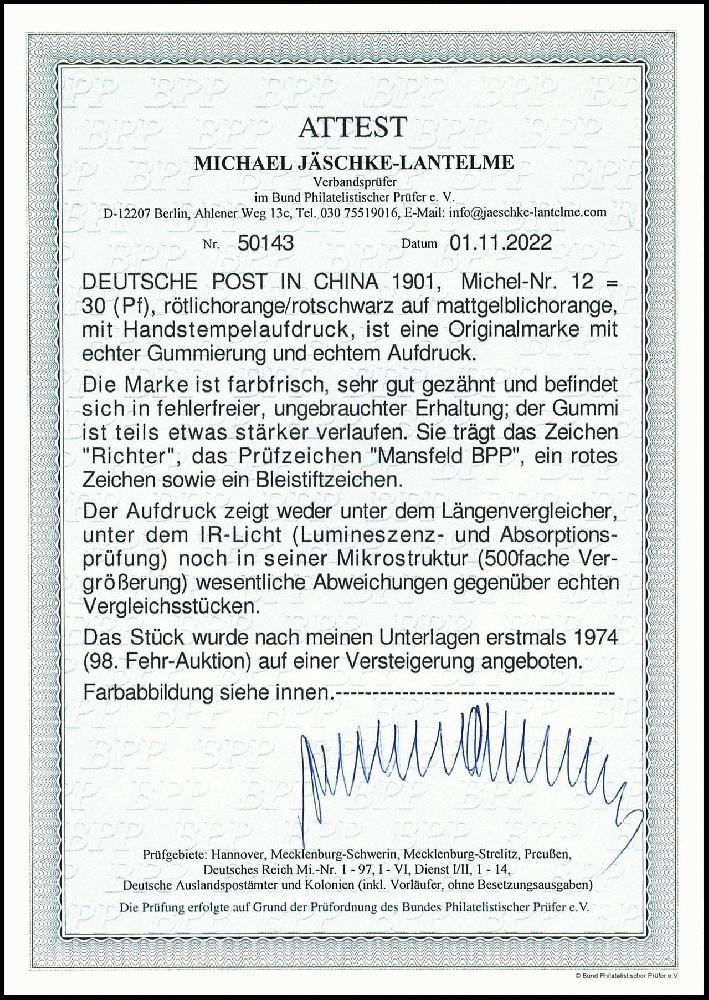 | Zusatzinformationen und Suchstichworte: | Dr. Reinhard Fischer 190. Auktion 27. - 28. Januar 2023 Los 54 Deutsche Auslandspost China 30 Pfg Germania Reichspost mit Handstempel-Aufdruck "China", tadellos ungebraucht mit Originalgummierung, sehr farbfrisches Kabinettstück der seltenen Marke, Fotoattest Jäschke-Lantelme BPP (2022) : "farbfrisch, sehr gut gezähnt, in fehlerfreier, ungebrauchter Erhaltung. der Gummi ist teils etwas stärker verlaufen." Mi. 6.000.- - unterbewertet, die China-Handstempelausgaben sind ungebraucht wesentlich seltener als gestempelt! Ausruf 2.500,00 EUR |
