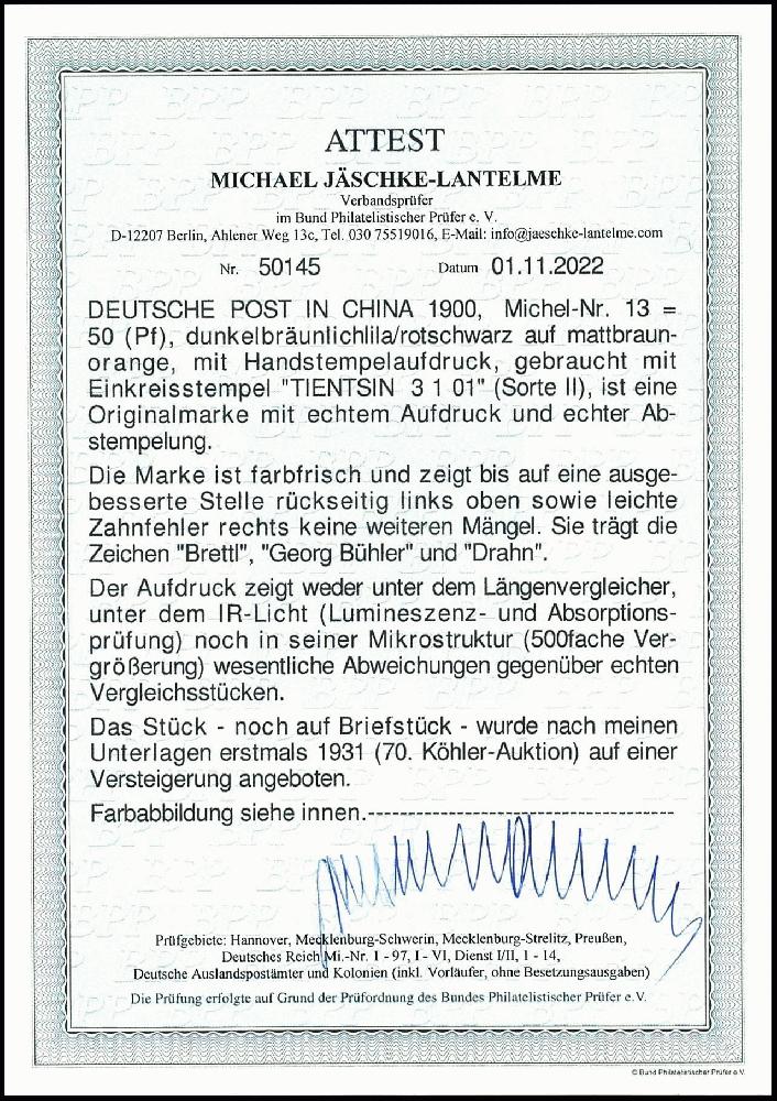 | Zusatzinformationen und Suchstichworte: | Dr. Reinhard Fischer 190. Auktion 27. - 28. Januar 2023 Los 55 Deutsche Auslandspost China 50 Pfennig Germania mit Handstempelaufdruck "China", entwertet "Tientsin 3 1 01" (Sorte II), abgesehen von einer ausgebesserten Stelle rückseitig links oben sowie leichten Zahnfehlern rechts befindet sich das Exemplar in ansprechender, farbfrischer Gesamterhaltung, gepr. Brettl, Drahn, Georg Bühler und Fotoattest Jäschke-Lantelme BPP (2022), Mi. 10.000.- - Diese Marke gehört zu den TOP-Seltenheit der Deutschen Auslandspostämter und Kolonien! Provenienz 70. Köhler Auktion 1931 (noch als Briefstück) Ausruf 2.000,00 EUR |