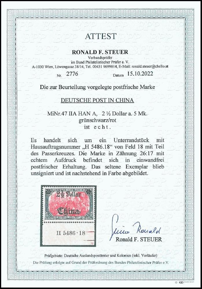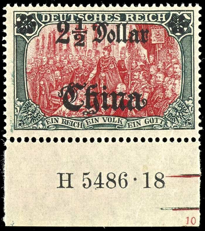 | Zusatzinformationen und Suchstichworte: | Dr. Reinhard Fischer 190. Auktion 27. - 28. Januar 2023 Los 58 Deutsche Auslandspost China 2 1/2 Dollar auf 5 Mark Deutsches Reich, Kriegsdruck, Wertaufdruck Mitte, Abstand 9 mm, Unterrandstück mit Aufdruck-Hausauftragsnummer "5486.18" und Plattennummer "10", tadellos postfrisch, sehr selten, unsigniert, Fotoattest Steuer BPP (2022): "in einwandfrei postfrischer Erhaltung. Das seltene Exemplar ...", Mi. 2.000.- Ausruf 600,00 EUR |