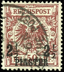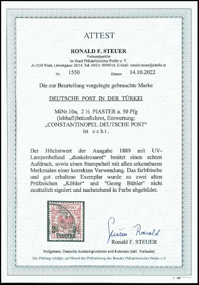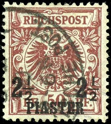 | Zusatzinformationen und Suchstichworte: | Dr. Reinhard Fischer 190. Auktion 27. - 28. Januar 2023 Los 70 Deutsche Auslandspost Türkei 2 1/2 Piaster auf 50 Pfennig Krone/Adler,. bräunlichrot, entwertet "Constantinopel Deutsche Post", tadellose Erhaltung, gepr. Köhler, Georg Bühler und Fotoattest Steuer BPP (2022): "gut erhaltene Vorlage.", Mi. 550.- Ausruf 150,00 EUR |