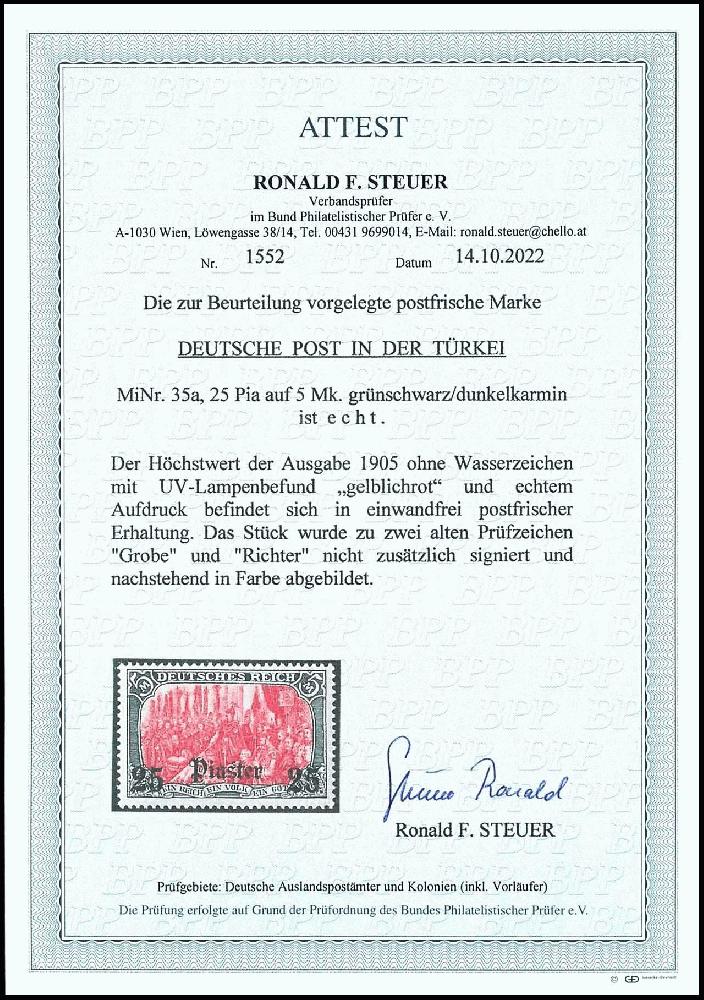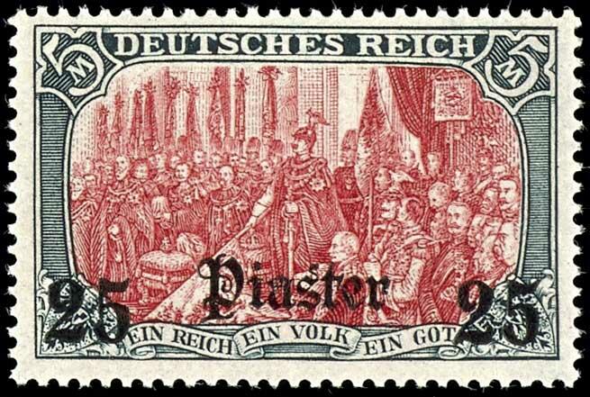 | Zusatzinformationen und Suchstichworte: | Dr. Reinhard Fischer 190. Auktion 27. - 28. Januar 2023 Los 74 Deutsche Auslandspost Türkei 25 Piaster auf 5 Mark Deutsches Reich grünschwarz/dunkelkarmin (UV = gelblichrot), tadellos postfrisch, gepr. Grobe, Richter und Fotoattest Steuer BPP (2022): "in einwandfrei postfrischer Erhaltung.", Mi. 650.- Ausruf 220,00 EUR |