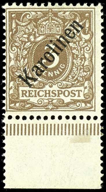 | Zusatzinformationen und Suchstichworte: | Dr. Reinhard Fischer 190. Auktion 27. - 28. Januar 2023 Los 79 Deutsche Kolonien Karolinen 3 Pfennig Krone/Adler mit schwarzem, diagonalem Bdr.-Aufdruck "Karolinen", Unterrandstück, ungebraucht mit Originalgummierung, tadellose Erhaltung, gepr. Bothe BPP (doppelte Signatur) und Fotoattest Steuer BPP (2022): "qualitativ einwandfrei", Mi. 750.- Ausruf 220,00 EUR |