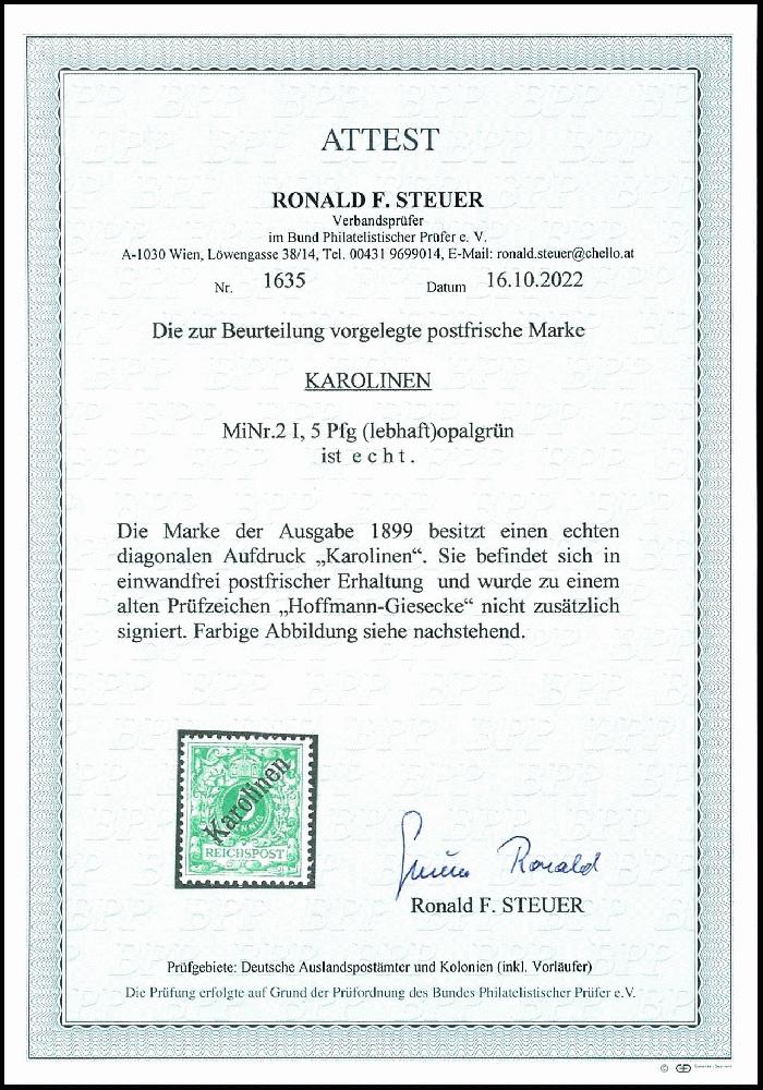 | Zusatzinformationen und Suchstichworte: | Dr. Reinhard Fischer 190. Auktion 27. - 28. Januar 2023 Los 80 Deutsche Kolonien Karolinen 5 Pfg Krone/Adler mit diagonalem Aufdruck "Karolinen", tadellos postfrisch, in dieser Qualität eine seltene Marke, gepr. Hoffmann-Giesecke und Fotoattest Steuer BPP (2022): "in einwandfrei postfrischer Erhaltung.", Mi. 2.000.- in unserer 180. Auktion erzielten wir für eine Marke in gleicher Qualität 850.- Euro zzgl. Aufgeld Ausruf 600,00 EUR |