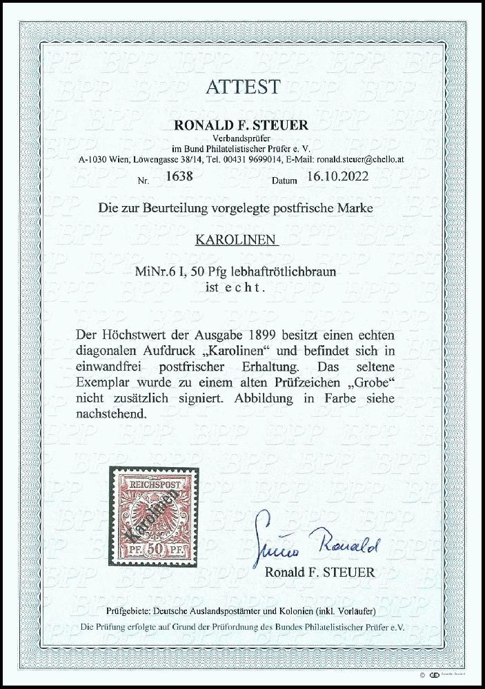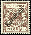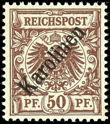 | Zusatzinformationen und Suchstichworte: | Dr. Reinhard Fischer 190. Auktion 27. - 28. Januar 2023 Los 82 Deutsche Kolonien Karolinen 50 Pfennig Krone/Adler, lebhaftrötlichbraun mit diagonalem Bdr.-Aufdruck "Karolinen", tadellos postfrisch, gepr. Grobe und Fotoattest Steuer BPP (2022): "in einwandfrei postfrischer Erhaltung.", Mi. 1.800- Ausruf 500,00 EUR |