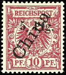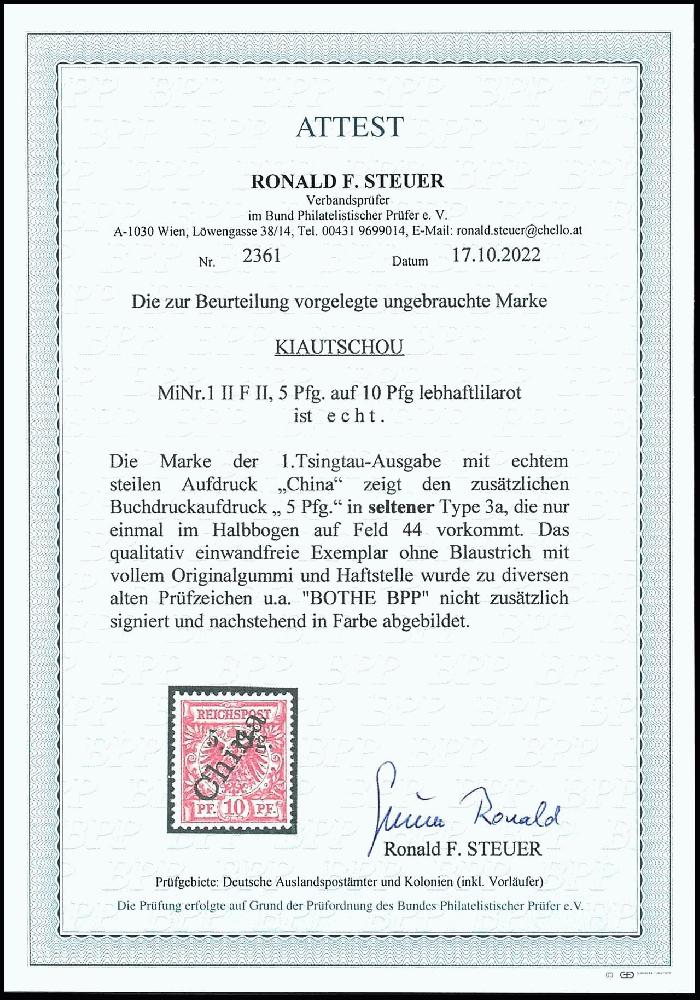 | Zusatzinformationen und Suchstichworte: | Dr. Reinhard Fischer 190. Auktion 27. - 28. Januar 2023 Los 85 Deutsche Kolonien Kiautschou 5 Pfg. auf 10 Pfennig Krone/Adler , lebhaftlilarot mit schwarzem, steilem Aufdruck "China", Aufdruck in Type 3a, Abart "ohne Blaustrich", tadellos ungebraucht, seltene Marke - zumal mit der sehr selten Aufdrucktype, Fotoattest Steuer BPP (2022): "qualitativ einwandfrei", Mi. 600.- Ausruf 200,00 EUR |