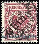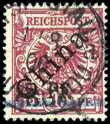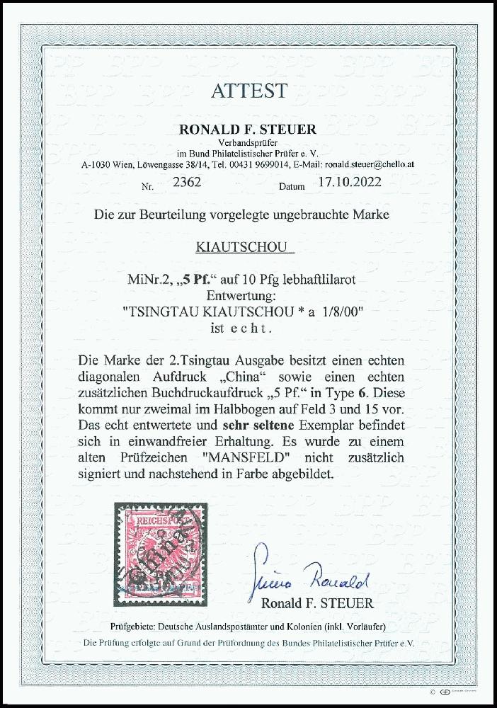| Zusatzinformationen und Suchstichworte: | Dr. Reinhard Fischer 190. Auktion 27. - 28. Januar 2023 Los 86 Deutsche Kolonien Kiautschou 5 Pf. auf 10 Pfennig Krone/Adler lebhaftlilarot mit schwarzem, diagonalem Bdr.-Aufdruck "China", Aufdruck in Type 6 - welche nur zweimal im Halbbogen auf Feld 3 und 15 vorkommt, entwertet "Tsingtau Kiautschou * a 1/8 00", gepr. Mansfeld mit Attest und Fotoattest Steuer BPP (2022): "... sehr seltene Exemplar befindet sich in einwandfreier Erhaltung.", Mi. 5.000.- (ohne Aufschlag für die sehr seltene Aufdrucktype 6!) Ausruf 1.800,00 EUR |