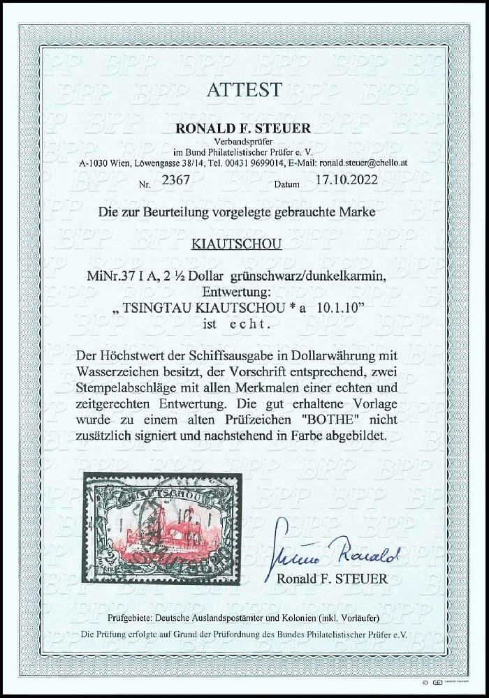 | Zusatzinformationen und Suchstichworte: | Dr. Reinhard Fischer 190. Auktion 27. - 28. Januar 2023 Los 90 Deutsche Kolonien Kiautschou 5 Mark Kaiseryacht grünschwarz/dunkelkarmin, Friedensdruck, 26 : 17 Zähnungslöcher, vorschriftsmäßig mit zwei Abschlägen klar entwertet "Tsingtau Kiautschou * a 10.1.10", tadellose Erhaltung, gepr. Bothe und Fotoattest Steuer BPP (2022): "gut erhaltene Vorlage", Mi. 600.- Ausruf 200,00 EUR |