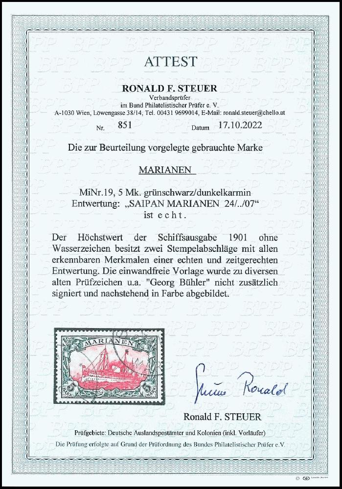 | Zusatzinformationen und Suchstichworte: | Dr. Reinhard Fischer 190. Auktion 27. - 28. Januar 2023 Los 94 Deutsche Kolonien Marianen 5 Mark Kaiseryacht, tadellos gestempelt "SAIPAN", gepr. Bühler und Fotoattest Steuer BPP (2022): "einwandfreie Vorlage.", Mi. 600.- Ausruf 180,00 EUR |