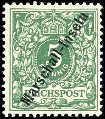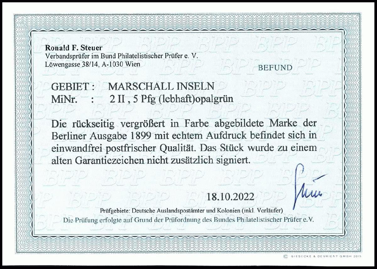 | Zusatzinformationen und Suchstichworte: | Dr. Reinhard Fischer 190. Auktion 27. - 28. Januar 2023 Los 96 Deutsche Kolonien Marshall Inseln 5 Pfg Krone/Adler, lebhaftopalgrün mit Bdr.-Aufdruck "Marschall-Inseln" sog. Berliner-Ausgabe, tadellos postfrisch, Garantiezeichen und Fotobefund Steuer BPP (2022): "einwandfrei postfrischer Qualität.", Mi. 400.- - in unserer 186. Auktion erzielten wir für ein gleichwertiges Stück 270.- Euro zzgl. Aufgeld! Ausruf 120,00 EUR |