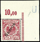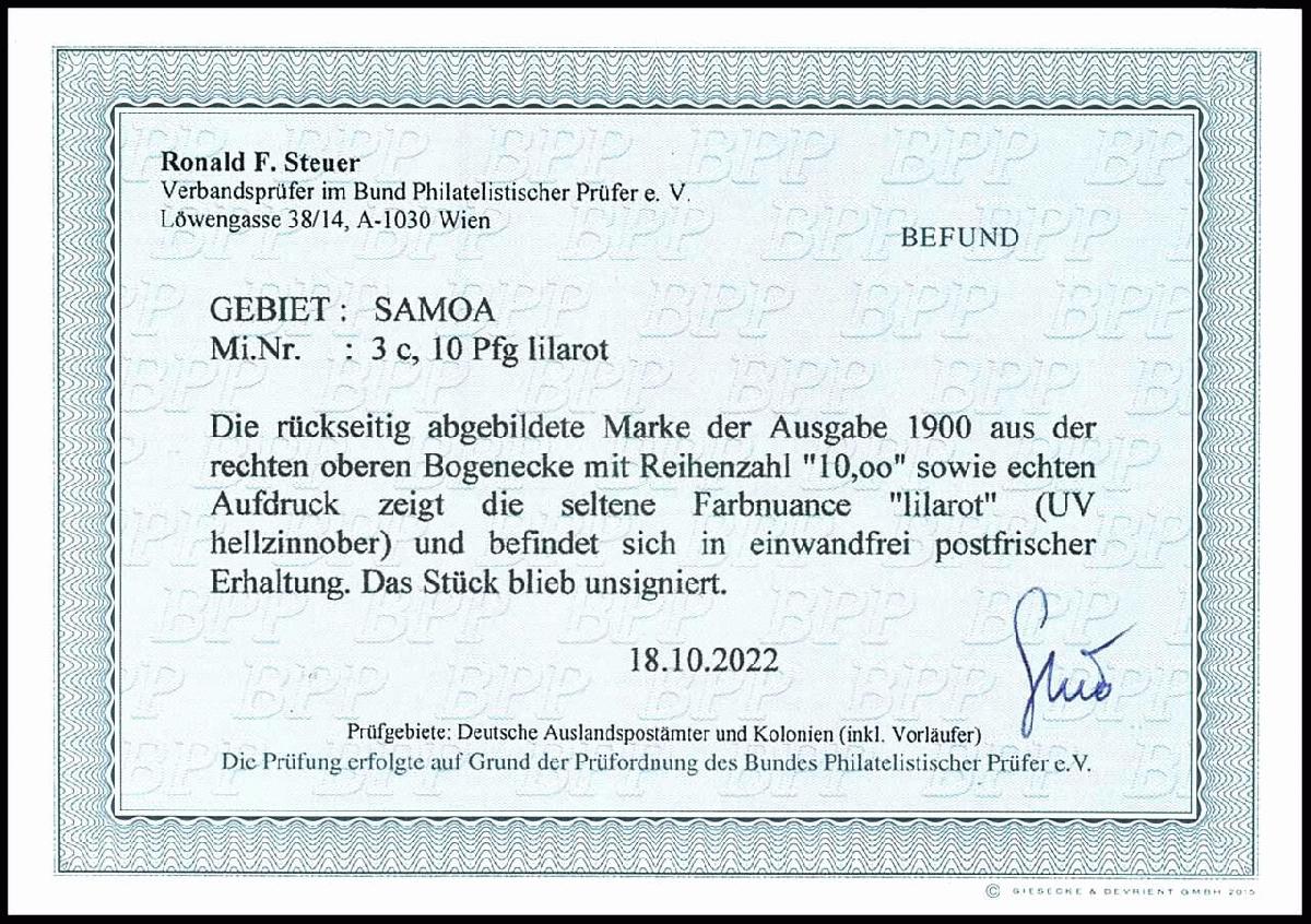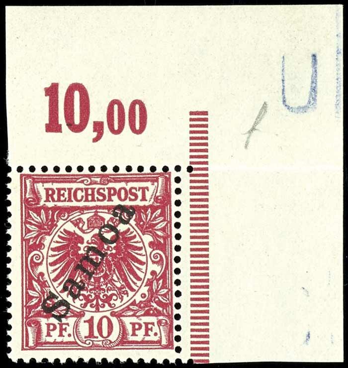 | Zusatzinformationen und Suchstichworte: | Dr. Reinhard Fischer 190. Auktion 27. - 28. Januar 2023 Los 97 Deutsche Kolonien Samoa 10 Pfennig Krone/Adler, lilarot mit schwarzem Bdr.-Aufdruck "Samoa", Eckrandstück oben rechts (vorgefaltet, Rand *), Marke tadellos postfrisch, Fotobefund Steuer BPP (2022): "in einwandfrei postfrischer Erhaltung.", Mi. 350.- - wir konnten diese Type letztmalig in unserer 136. Auktion anbieten, eine wirklich seltene Farbnuance! Ausruf 120,00 EUR |