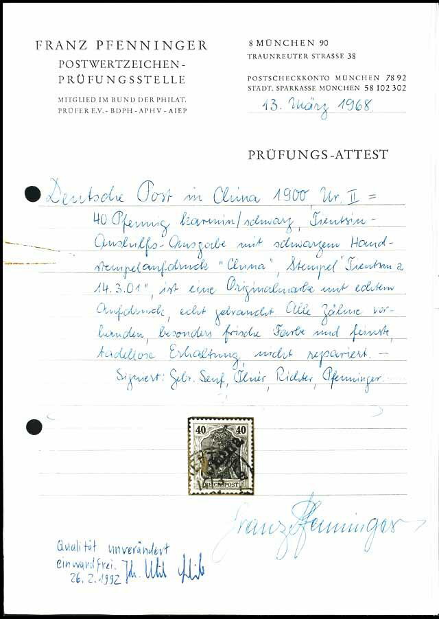 | Zusatzinformationen und Suchstichworte: | Dr. Reinhard Fischer 190. Auktion 27. - 28. Januar 2023 Los 2481 Deutsche Auslandspost China Amtlich nicht ausgegeben: 40 Pfennig Germania mit Handstempel-Aufdruck "China", entwertet mit Einkreisstempel "Tientsin 14/3 (01)". farbfrisches und sehr gut gezähntes Kabinettstück dieser großen Seltenheit, geprüft Pfenninger mit Attest (1968), Richter, Gebr. Senf, Thier sowie Fotoattest Jäschke-Lantelme BPP: "in fehlerfreier, gebrauchter Erhaltung.", Mi. 40.000.- Ausruf 14.000,00 EUR |