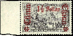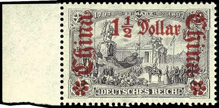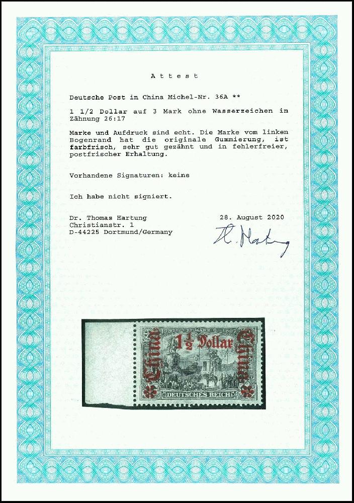 | Zusatzinformationen und Suchstichworte: | Dr. Reinhard Fischer 190. Auktion 27. - 28. Januar 2023 Los 2512 Deutsche Auslandspost China 1 1/2 Dollar auf 3 Mark ohne Wasserzeichen in der seltenen Zähnung 26:17 tadellos postfrisch vom linken Bogenrand, noch unsigniert, Fotoattest Dr. Hartung: "sehr gut gezähnt und in fehlerfreier, postfrischer Erhaltung." Mi. 1.200.- Ausruf 350,00 EUR |