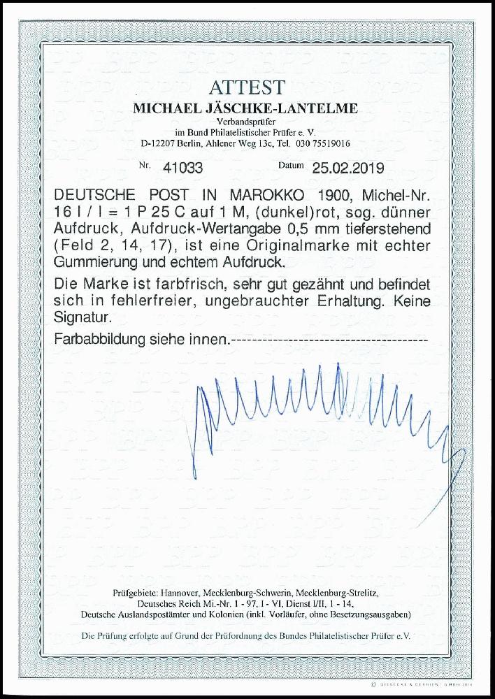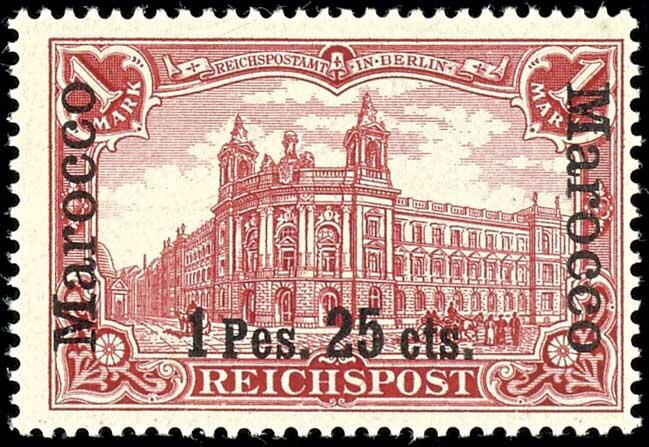 | Zusatzinformationen und Suchstichworte: | Dr. Reinhard Fischer 190. Auktion 27. - 28. Januar 2023 Los 2589 Deutsche Auslandspost Marokko 1,25 Pes. auf 1 Mark dunkelrot Deutsches Reich, dünner Aufdruck, Wertangabe 0,5 mm tieferstehend, tadellos ungebraucht, Fotoattest Jäschke-Lantelme BPP (2019): "in fehlerfreier, ungebrauchter Erhaltung.", Mi. 500.- Ausruf 170,00 EUR |