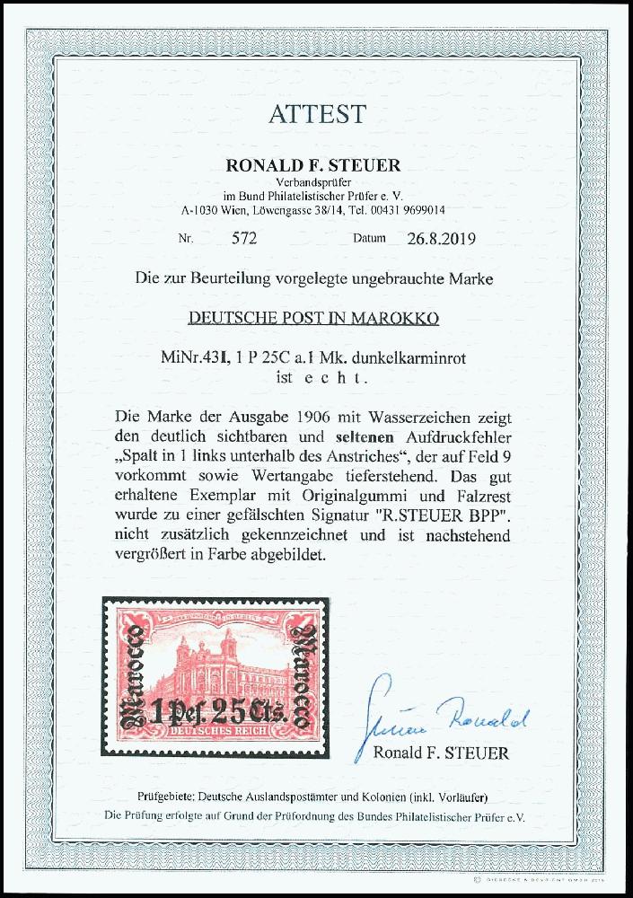 | Zusatzinformationen und Suchstichworte: | Dr. Reinhard Fischer 190. Auktion 27. - 28. Januar 2023 Los 2615 Deutsche Auslandspost Marokko 1,25 Pes. auf 1 Mark Deutsches Reich, seltener Aufdruckfehler "Spalt in 1 links unterhalb des Anstriches" (Feld 9) sowie Wertangabe tieferstehend, tadellos ungebraucht, Fotoattest Steuer BPP (2019): " gut erhaltene Exemplar.", Mi. 550.- Ausruf 130,00 EUR |