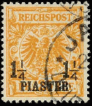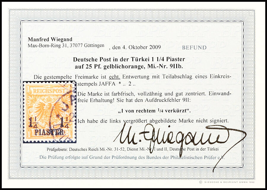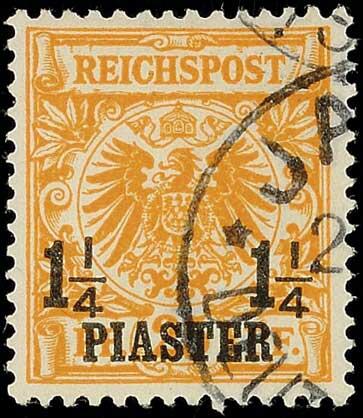| Zusatzinformationen und Suchstichworte: | Dr. Reinhard Fischer 190. Auktion 27. - 28. Januar 2023 Los 2686 Deutsche Auslandspost Türkei 1¼ Pia. auf 25 Pfg Krone/Adler gelblichorange, Plattenfehler "rechts verkürzte 1", gestempelt JAFFA, Fotobefund Wiegand BPP: "echt, einwandfreie Erhaltung", Mi. 300.- Ausruf 75,00 EUR |