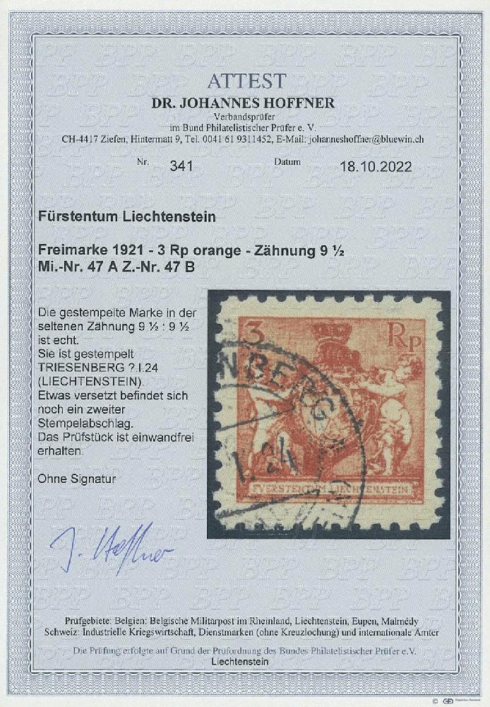 | Zusatzinformationen und Suchstichworte: | Ulrich Felzmann 35. e@uction 18. - 20. Januar 2023 Los 12532 Liechtenstein 3 Rp Landeswappen mit weiter Zähnung 9½, zeitgerecht gestempelt in tadelloser, vollzähniger Ausnahmequalität, zweifach attestiert Reinhardt sowie Hoffner BPP "... einwandfrei erhalten" (Zst. 47B) - In dieser Qualität eine der seltensten Freimarken Liechtensteins, € 6.000,- Ausruf 1.500,00 EUR |
