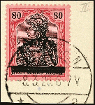 | Zusatzinformationen und Suchstichworte: | Ulrich Felzmann 35. e@uction 18. - 20. Januar 2023 Los 14079 Saargebiet 80 Pfg Germania/Sarre in Type III mit Abart "S oben abgeschliffen", tadellos auf Briefstück, Fotoattest Herbert Ney BPP, € 1.100,- Ausruf 200,00 EUR |