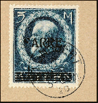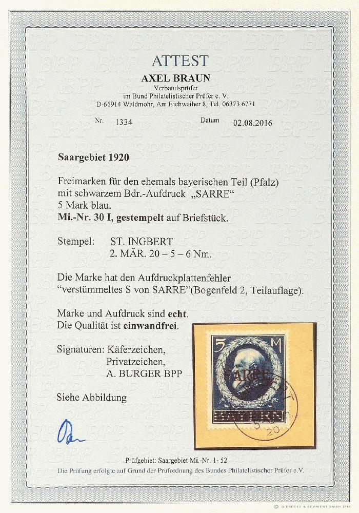 | Zusatzinformationen und Suchstichworte: | Ulrich Felzmann 35. e@uction 18. - 20. Januar 2023 Los 14083 Saargebiet 5 Mark Bayern/Sarre mit Aufdruckabart "verstümmeltes S in SARRE" tadellos auf Briefstück, sign. Burger BPP sowie Fotoattest Braun BPP "... einwandfrei", € 3.500,- Ausruf 700,00 EUR |