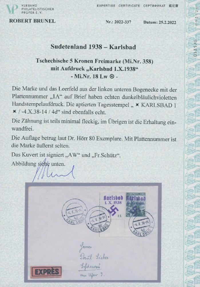 | Zusatzinformationen und Suchstichworte: | Ulrich Felzmann 35. e@uction 18. - 20. Januar 2023 Los 14154 Sudetenland Karlsbad 5 Kc Olmütz mit links anhängendem, ebenfalls überdrucktem Leerfeld mit Plattennummer "1A" (!) und kleinem Bogenrand, in der Zähnung minimal fleckige, tadellos vollzähnige linke untere Bogenecke mit Vollstempeln 4.X.38 auf adressiertem Kuvert, Fotoattest Brunel "Mit Plattennummer ist die Marke äußerst selten" Ausruf 800,00 EUR |