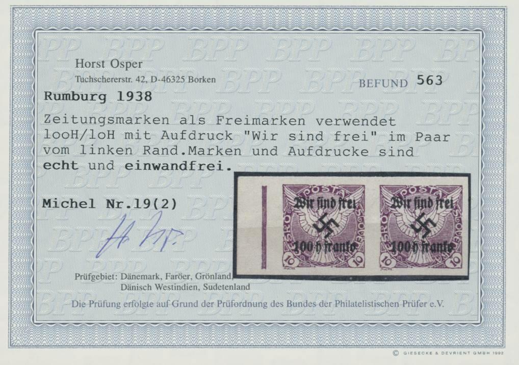 | Zusatzinformationen und Suchstichworte: | Ulrich Felzmann 35. e@uction 18. - 20. Januar 2023 Los 14161 Sudetenland Rumburg 100 auf 10 H Zeitungsmarke im postfrischen (!) Rand-Paar in unsignierter (!) Luxuserhaltung, Fotobefund Osper BPP "... einwandfrei", € 160,- Ausruf 50,00 EUR |