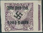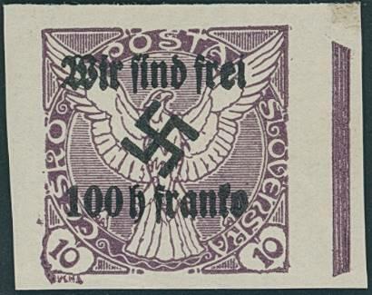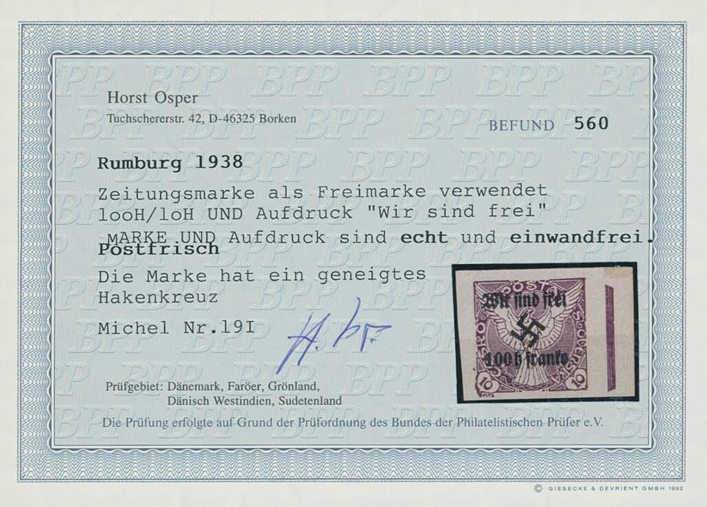 | Zusatzinformationen und Suchstichworte: | Ulrich Felzmann 35. e@uction 18. - 20. Januar 2023 Los 14162 Sudetenland Rumburg 100 auf 10 H Zeitungsmarke mit Aufdruckfehler "geneigtes Hakenkreuz", postfrisch mit rechtem Bogenrand, dort Haftstelle, Fotobefund Osper BPP "einwandfrei" Ausruf 50,00 EUR |