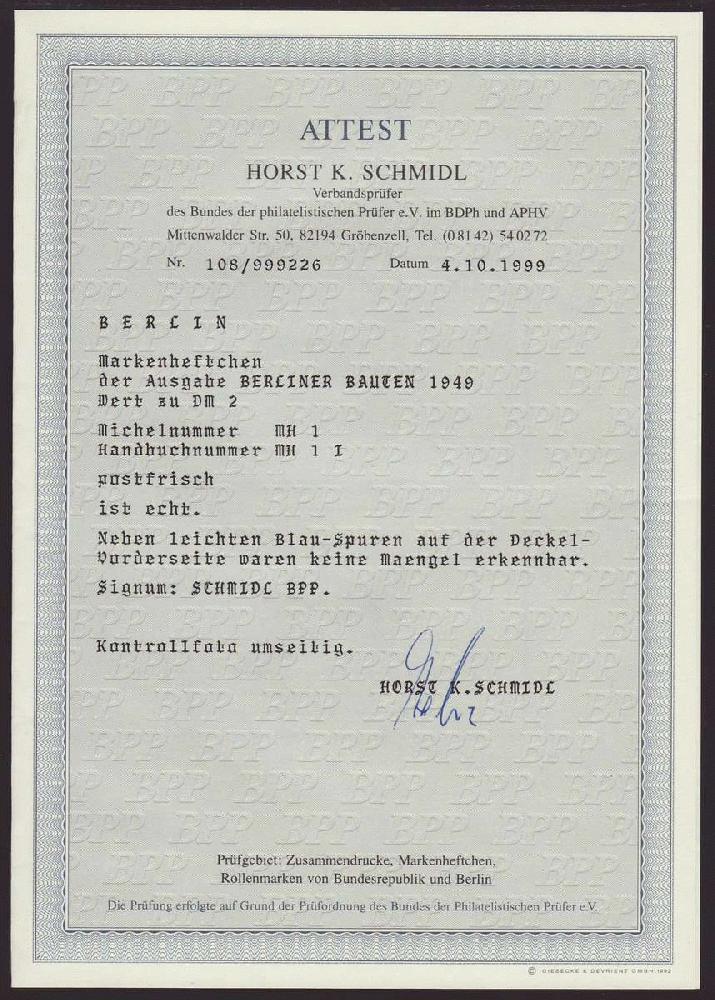 | Zusatzinformationen und Suchstichworte: | Christian E. Geigle Briefmarkenfachhandel Los 0003137507 Berlin 1949, Bauten I, postfrisches Markenheftchen in Prachtqualität, FA Schmidl "neben leichten Blau-Spuren auf der Deckelvorderseite waren keine Mängel erkennbar" Festpreis 245,00 EUR |