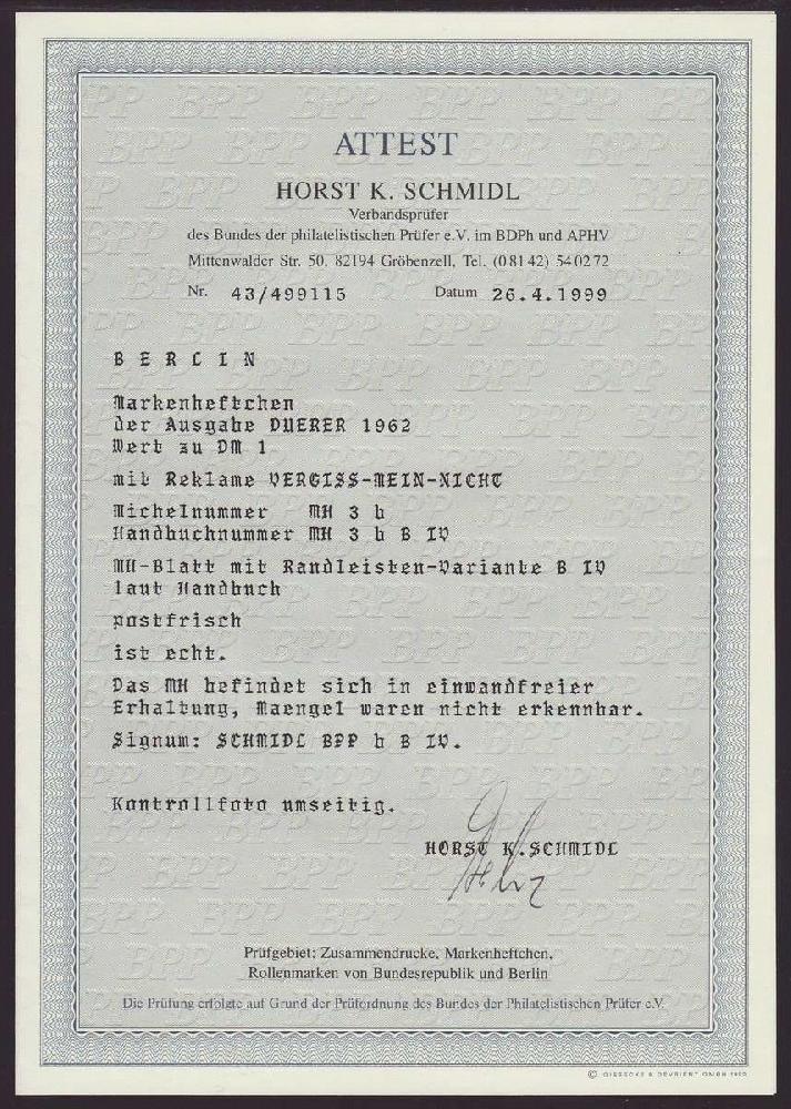 | Zusatzinformationen und Suchstichworte: | Christian E. Geigle Briefmarkenfachhandel Los 0003137552 Berlin 1962, Dürer, postfrisches Markenheftchen in der Deckelvariante "b", RLV IV, enthält Heftchenblatt 11 B, Kabinett, FA Schmidl "einwandfrei" Festpreis 450,00 EUR |