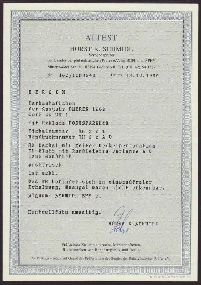 | Zusatzinformationen und Suchstichworte: | Christian E. Geigle Briefmarkenfachhandel Los 0003137558 Berlin 1962, Dürer, postfrisches Markenheftchen in der Deckelvariante "c I" (Deckelperforation 14 Löcher, Deckelfarbe chromgelb), RLV V, enthält Heftchenblatt 11 A, Kabinett, FA Schmidl "einwandfrei" Festpreis 320,00 EUR |