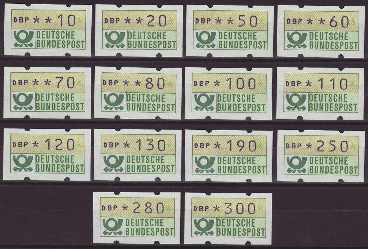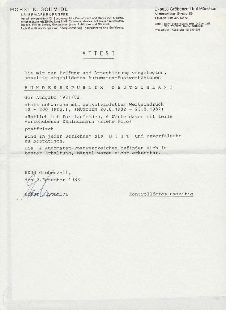 | Zusatzinformationen und Suchstichworte: | Christian E. Geigle Briefmarkenfachhandel Los 0003144881 Bundesrepublik Deutschland 1982, Postemblem, Type 1, gelbliche Gummierung, 10 Pf. bis 300 Pf. mit dunkelviolettem statt schwarzem Werteindruck (München 20.08.1982 bis 23.08.1982, sog. "Blaue Münchner"), 14 W. kpl., postfrischer Luxusatz dieser seltenen Abart, die Marken weisen rückseitig fortlaufende (!) Zählnummern auf, in dieser Form einmaliger Satz und wohl kein zweites Mal zu beschaffen, altes FA Schmidl "einwandfrei" ohne jegliche Signaturen auf den Marken, was bei Herrn Schmidl normalerweise nicht möglich war, mir ist kein weiterer Schmidl-attestierter und unsignierter Satz bekannt Festpreis 1.750,00 EUR |