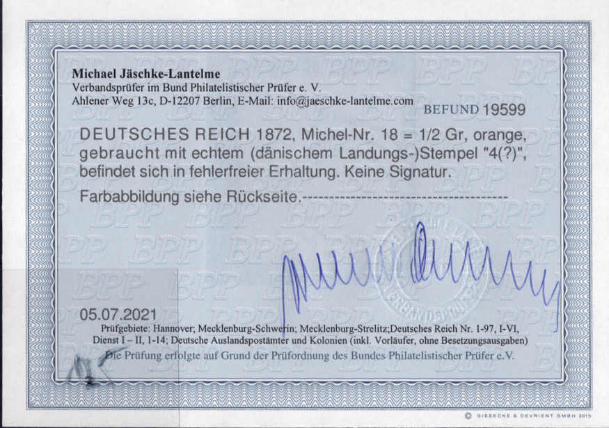 | Zusatzinformationen und Suchstichworte: | AAK Phila GmbH 78. Auktion 1. Juli 2023 Los 3904 (D) Deutsches Reich "4?", dänischer Landungsstpl. zentr. a. 1/2 Gr gr. Schild m. einwandfreiem Befund Jäschke-L. BPP! Seltener Stpl.! Ausruf 50,00 EUR |