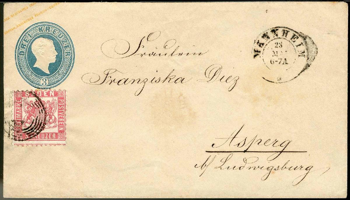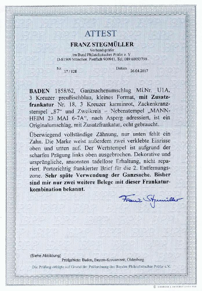 | Zusatzinformationen und Suchstichworte: | 119. Veuskens Auktion 12. Januar 2023 Los 894 Altdeutschland Baden 3 Kr. GA-Umschlag 1858, mit faszinierender, wertgleicher MiF in vers. Farben und Spätverwendung. Gelaufen von Mannheim 23. Mai 6-7A, mit Zacken-Kranzstpl. '87' nach Asperg in Württemberg, als 6 Kr.-Postvereinsfrankatur in vollkommen ursprüngl. und sehr attraktiver Erhaltung. Sowohl die GA als auch die Marke (offensichtl. eine sog. 'Portemonnaie-Marke') mit vollkommen unauffälligen, ursprüngl. kl. Fehlern, welche bei der Seltenheit dieser MiF unerhebl. sind. Gemäß ausführl. Farbfotoattest Stegmüller BPP sind nur zwei weitere Exemplare dieser Frankaturkombination bekannt. Ausruf 400,00 EUR |
