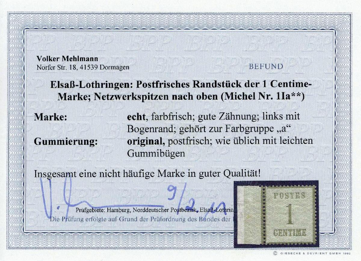 | Zusatzinformationen und Suchstichworte: | 119. Veuskens Auktion 12. Januar 2023 Los 1088 Altdeutschland NDP Elsass-Lothringen 1 C. Freimarke 1870, in Type I., in a.-Farbe, mit linkem Seitenrand, tadellos postfrisch, in dieser Erhaltung seltene Marke, mit Farbfotobefund Mehlmann BPP 'echt, farbfrisch, gute Zähnung, gute Qualität', Pracht. Zuschlag 55,00 EUR |