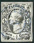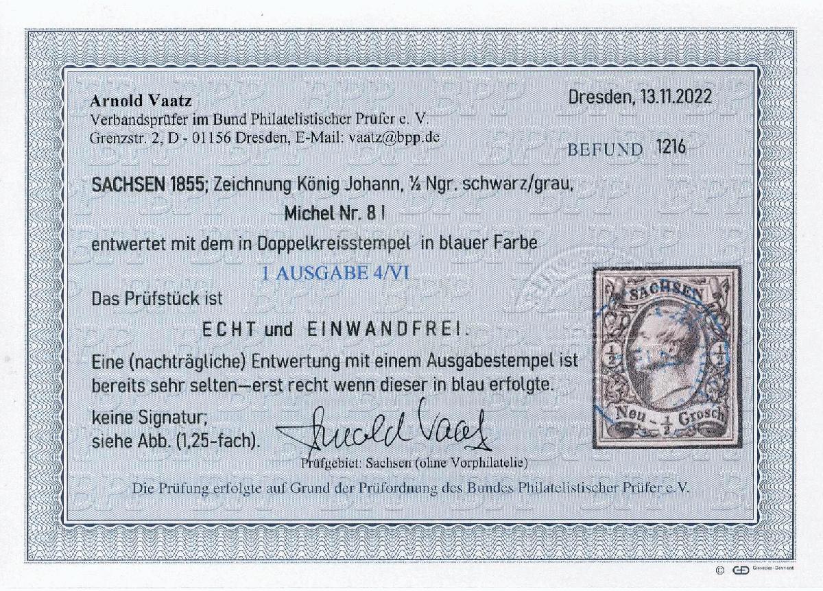 | Zusatzinformationen und Suchstichworte: | 119. Veuskens Auktion 12. Januar 2023 Los 1157 Altdeutschland Sachsen 1/2 Ngr. Johann 1855, in Type I., mit nahezu zentr. blauem Ausgabestpl., Farbfotoattest Vaatz BPP 'echt und einwandfrei - eine nachträgl. Entwertung mit einem Ausgabestpl. ist bereits sehr selten - erst recht, wenn diese in blau erfolgte!', Liebhaberstück! Ausruf 100,00 EUR |